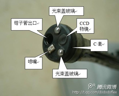 插入部的零部件9:先端頭。先端頭結構如下圖所示:包括C套、CCD物鏡、光束蓋玻璃、噴嘴、鉗子管出口。噴嘴口對準CCD物鏡,作用是送水送氣。送水是清洗物鏡蓋玻璃,避免贓物覆蓋影響圖像的觀察。送氣是使空腔臟器擴張,便于觀察;其次是把物鏡上殘留的水或其它黏液組織吹干凈。